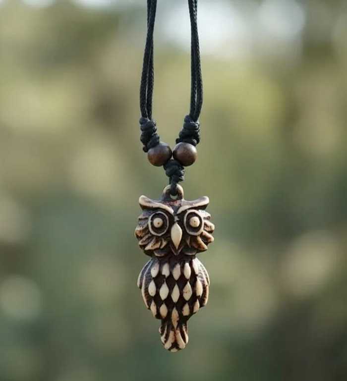 Colar de coruja em macramê, símbolo da sabedoria, da inteligência, do mistério e do misticismo.